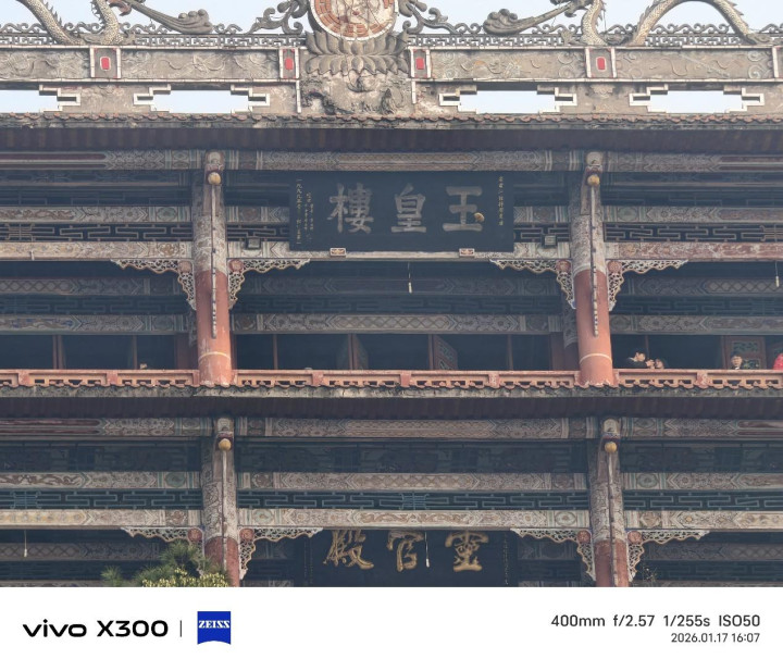 拍道观阁楼,200mm、400mm和800mm拍出的照片,建筑物的各种细节都很清晰,楼顶的龙雕、莲花宝座,屋檐上错落的红瓦以及房梁上各种手绘的图案都近在眼前,色彩也基本保持一致,1600mm通过算法拍出的照片色彩和清晰度有下降,但用这么长的焦距拍摄一般主要是为了拍清被摄主体,色彩要求可以退而求其次。