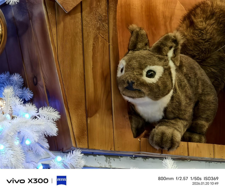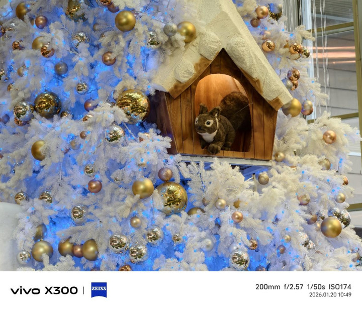 木屋里的松鼠憨态可掬,能从毛绒绒的材质上感受到柔软的触感,能看清旁边一根根被白雪覆盖的圣诞树枝条。