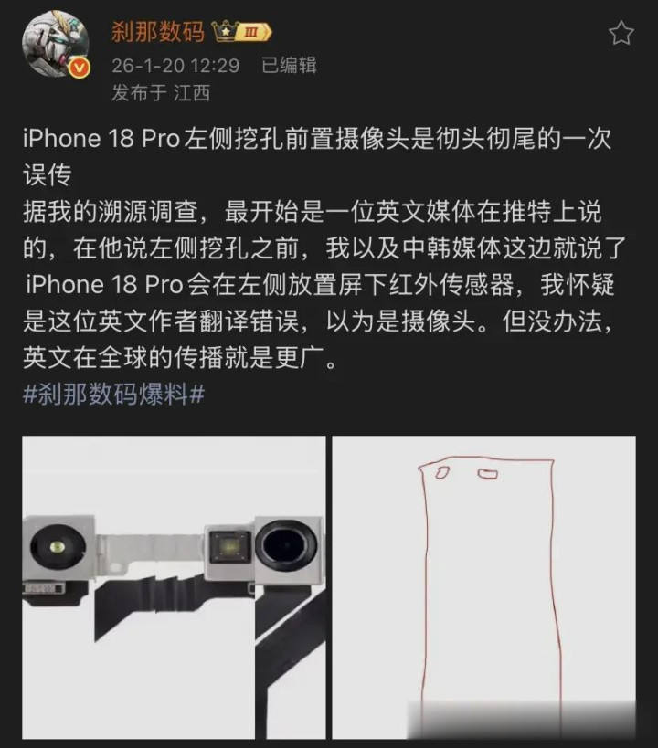 “iPhone 18 Pro左侧挖孔前置摄像头是彻头彻尾的一次误传。据我的溯源调查,最开始是一位英文媒体在推特上说的,在他说左侧挖孔之前,我以及中韩媒体这边就说了iPhone 18 Pro会在左侧放置屏下红外传感器,我怀疑是这位英文作者翻译错误,以为是摄像头。但没办法,英文在全球的传播就是更广。”