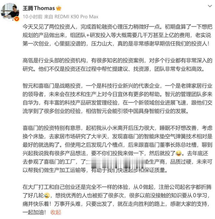 20日晚,王腾再发长文回应。他表示:老实说第一次创业,心里挺没谱的,压力山大,真的是非常感谢早期信任我们的投资人!在大厂打工和自己创业还是完全不一样的体验,从0做起,注册公司起名字都折腾了好几轮,想找优秀的人也被拒了很多次,很多以前没接触的知识要从0学习,痛并快乐着!万事开头难,只要出发了,就在走向胜利的路上,感谢大家的支持,一起加油!