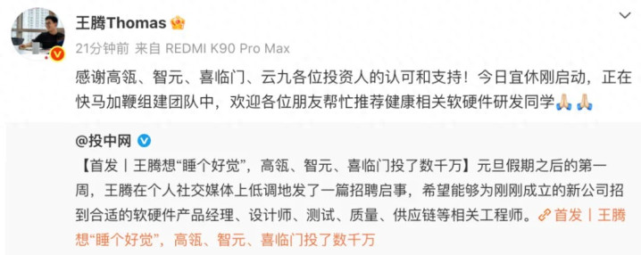 {jz:field.toptypename/}随后,原小米中国区市场部总经理,现今日宜休科技公司创始人王腾回应称:“感谢高瓴、智元、喜临门、云九各位投资人的认可和支持!今日宜休刚启动,正在快马加鞭组建团队中,欢迎各位朋友帮忙推荐健康相关软硬件研发同学。”