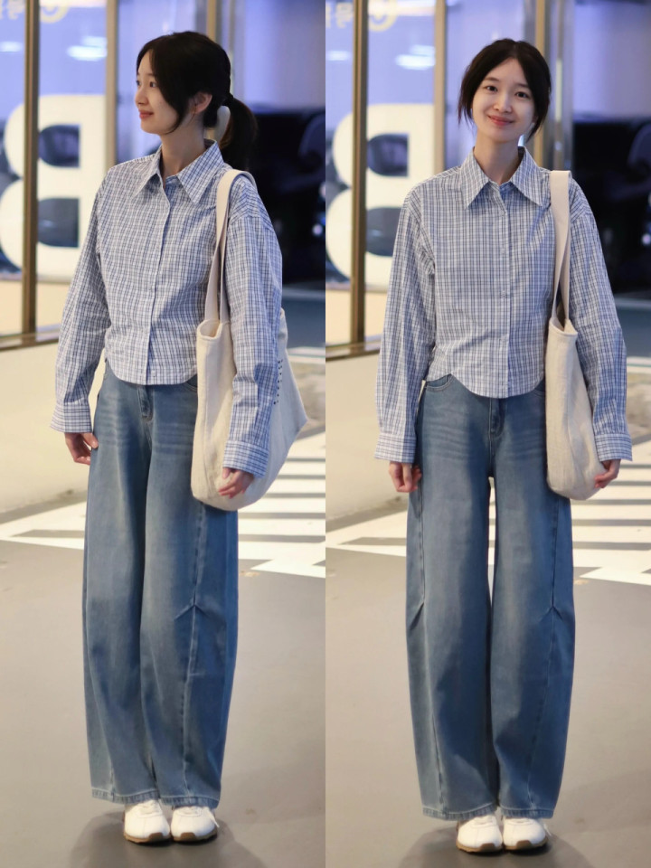 可爱利落通勤风,换一件格纹短款衬衫,配上蓝色牛仔直筒阔腿裤,脚上穿戴一对白色失业鞋,自带利落气场,检朴又耐看。