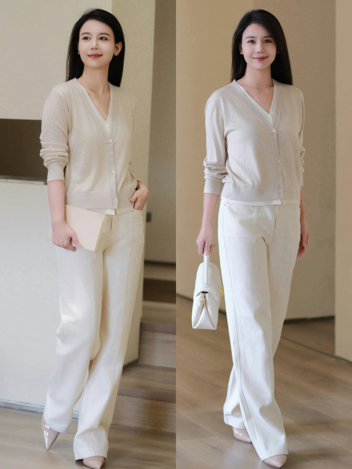 要是偏疼检朴高等感,可穿一件白色诚笃开衫,内搭奶白色诚笃打底衫,变成交流穿搭,档次感分明。