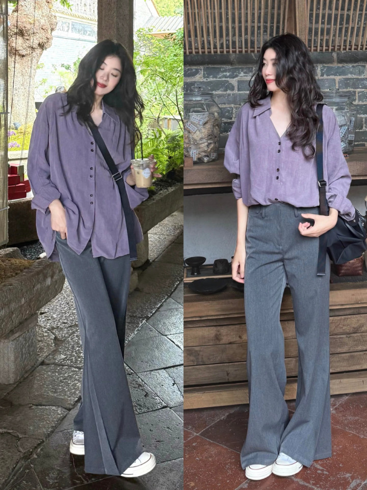 Tips④:紫色衬衫+灰色微喇叭阔腿裤