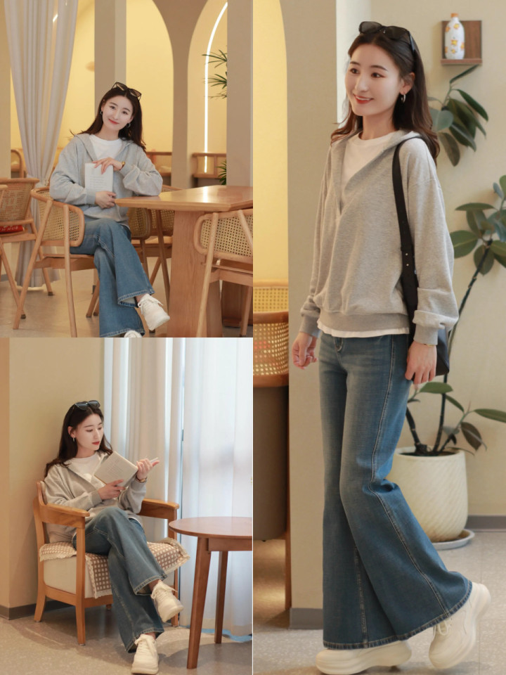 选拔灰色卫衣,内搭白 T 恤和一条微喇叭蓝色牛仔阔腿裤,脚穿小白鞋,这么的穿搭既缜密又洋气。