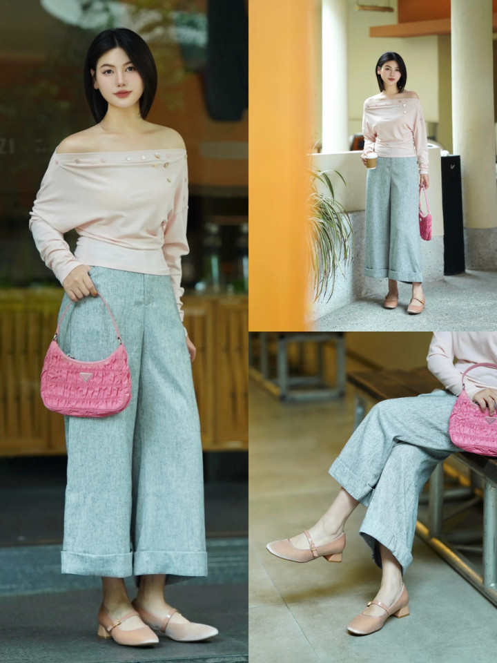 躯壳有点微胖开云app,不妨不错选拔微宽松的粉色一字肩上衣,搭配上蓝色的 九分阔腿裤,脚踩一对浅粉色的浅口低跟单鞋,既遮肉又能呈现好体态,稳当的清楚天鹅颈、锁骨和肩颈的上风,恰到平正地拿抓性感与前锋,让你秒变成前锋潮东谈主。
