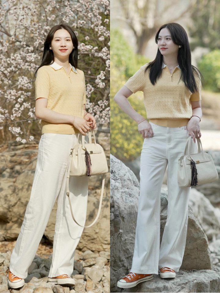 在这百鸟争鸣的季节,外出旅游拍照要更出片更上镜,确乎不错选拔亮色的衣服来穿搭。浅鹅黄色的诚笃短袖配上白色的牛仔直筒阔腿裤,脚上穿戴一对橘黄色的帆布鞋,既和煦又失业。