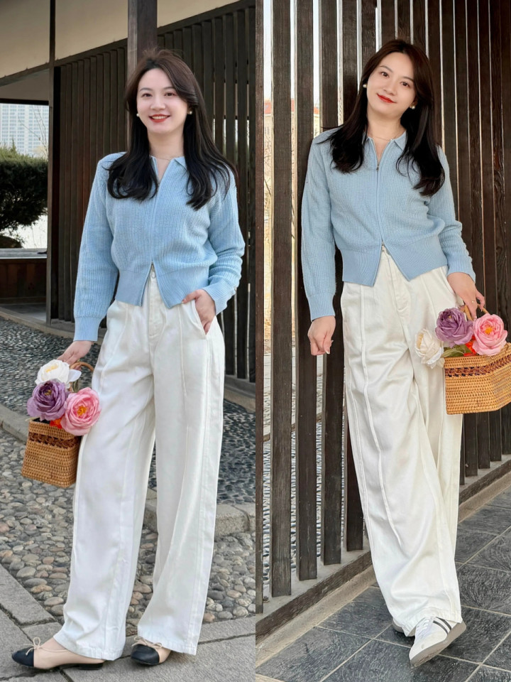 或者是选拔一件雾霾蓝的诚笃开衫,配上白色的直筒阔腿裤,脚踩一对玛丽珍鞋或者是德训鞋。检朴中又带着和煦的气质。