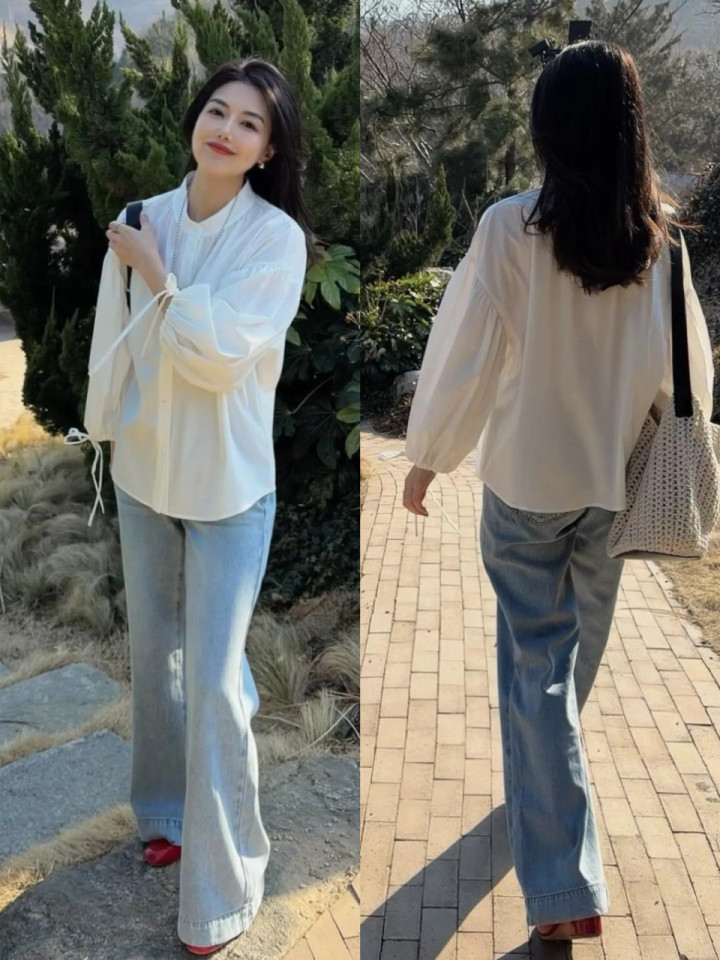 或是我们换成一件灯笼袖的白色衬衫面料柔嫩有垂坠感,穿在身上既有气质又宽广通勤。配上一条蓝色的牛仔直筒阔腿裤和红色低跟单鞋,整套抱成一团,气场满满。