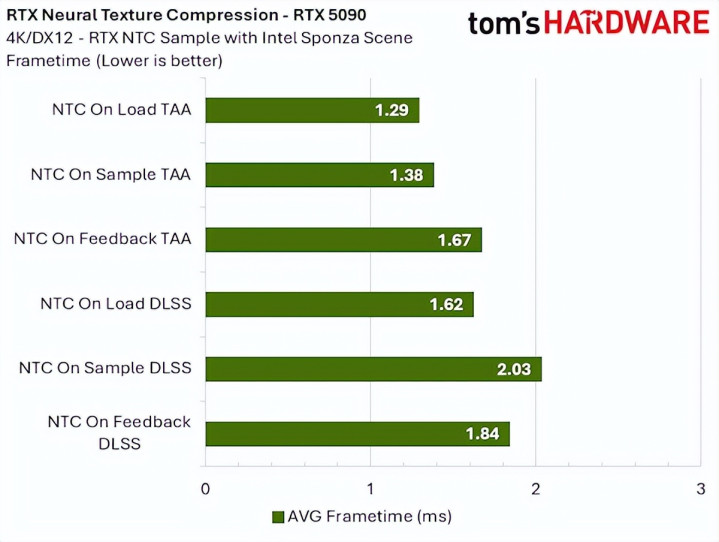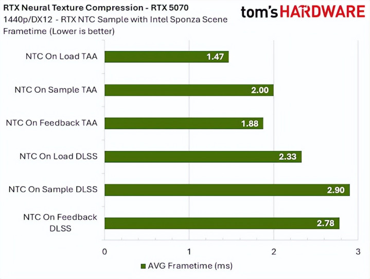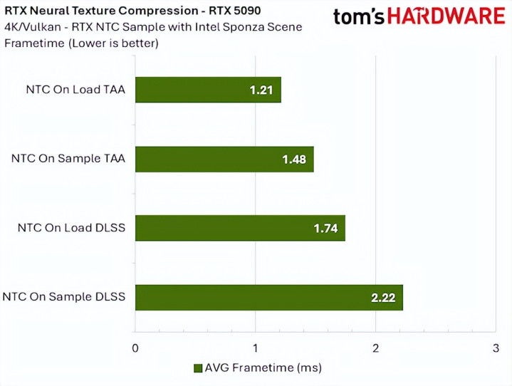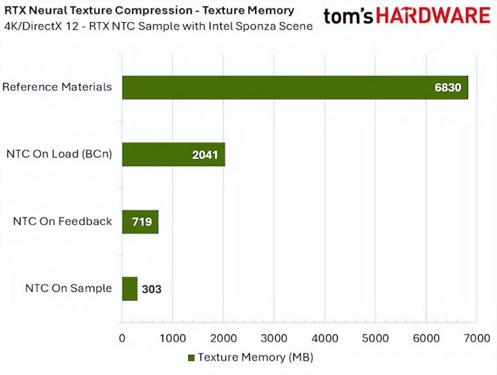 Tom's Hardware用行业通用的Intel Sponza模范场景完成了量化测试,实测数据实足贴合官方标称的压缩才智,原始无损参考材质的纹理显存占用为6830MB。加载时推理模式(Inference on Load)将纹理转码为BCn关节后,显存占用为 2041MB。
