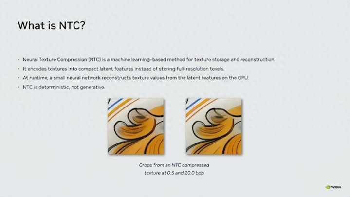 从本事旨趣来看,NTC是基于机器学习的纹理压缩与解压决议,亦然NVIDIA神经着色渲染新范式的中枢本事之一。它跳出了传统BCn块压缩关节(游戏行业通用的传统区块纹理压缩模范)4×4像素的固定按捺,在压缩阶段就将原始纹理回荡为袖珍神经网罗权重与潜在特征组合。