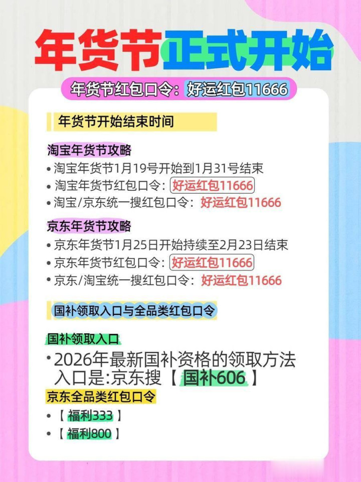 不看这篇你可能亏大!2026年货节红包口令是【好运红包11666】天猫/淘宝和京东统一都是这个口令,2026年货节淘宝京东同时开打,但90%的人都不知道这两个平台的最佳下单时间完全不同。有人1月19日零点剁手,结果1月25日同款又降300;有人等到除夕才下单,却发现快递已停运。今年年货节战线拉得特别长:淘宝从1月19日打到1月31日,京东更是从12月31日一直持续到2月23日,整整55天!但真正的"史低价窗口"只有6个黄金节点,特别是买iPhone 17系列、华为Mate 70这些爆款手机,领错券就差出上千块。我花了3天整理出这份包含12个隐藏口令、6个黄金时间窗、3个防坑指南的实战攻略,建议你直接收藏设置闹钟。