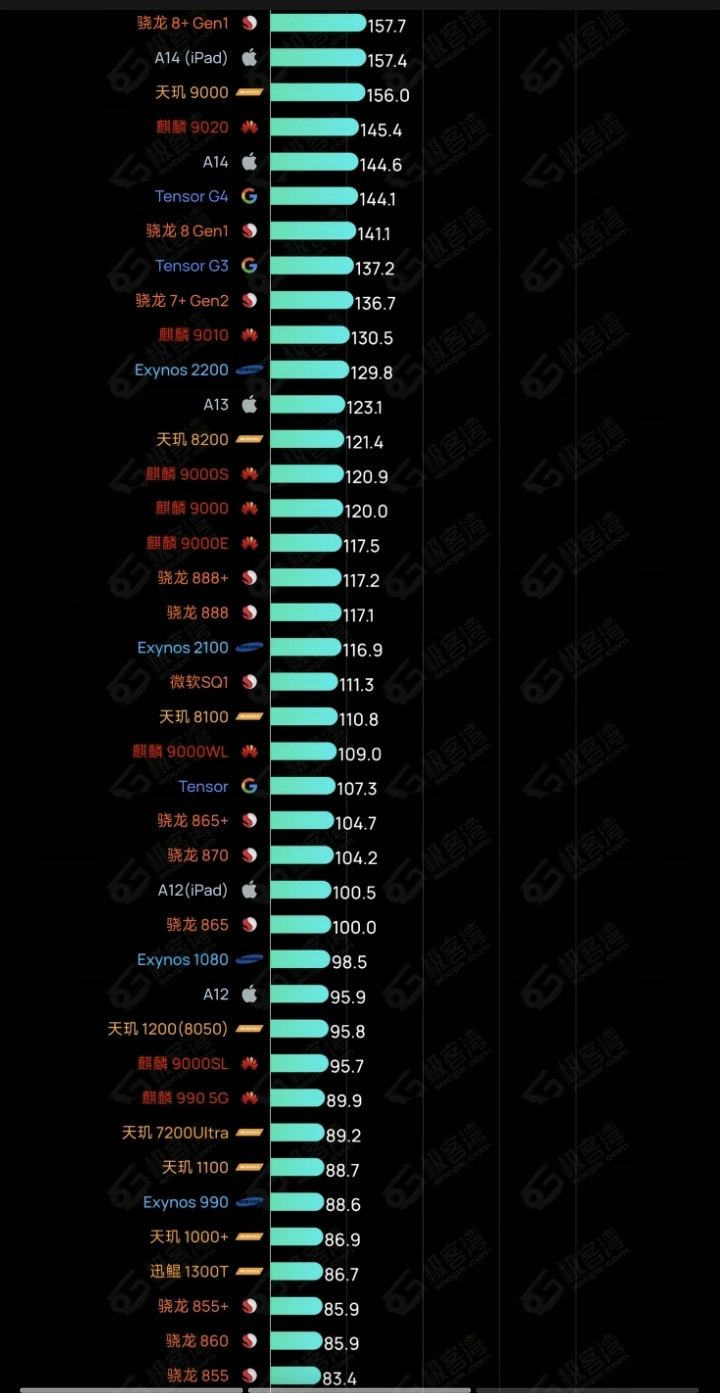 7:麒麟9000以120.0分排在第四十五,麒麟9000E以117.5分位列第四十六。骁龙888+以117.2分排在第四十七,骁龙888则以117.1分位列第四十八。Exynos 2100以116.9分排在第四十九,微软SQ1则以111.3分位列第五十。天玑8100以110.8分排在第五十一,麒麟9000WL以109.0分位列第五十二。Tensor G以107.3分排在第五十三,骁龙865+则以104.7分位列第五十四。