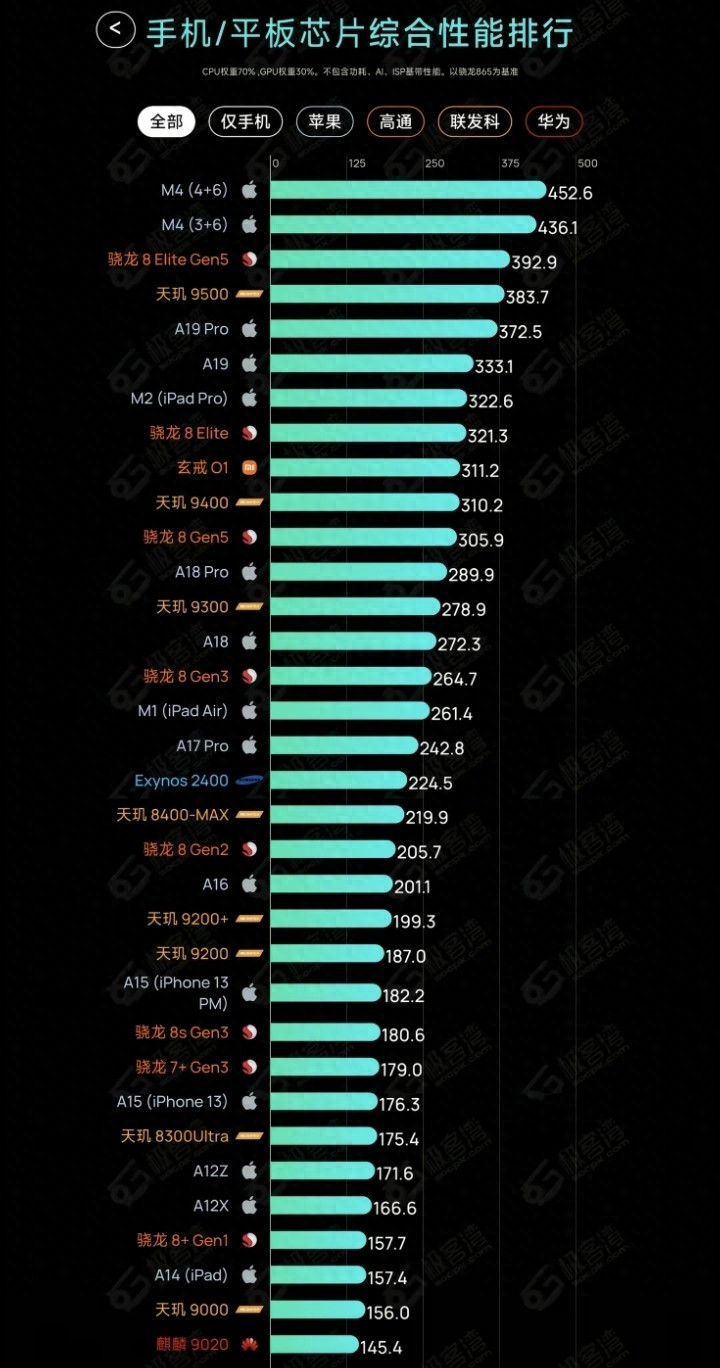 2:在榜单的顶端,苹果的M系列芯片展现了无与伦比的统治力。M4芯片的两个版本分别以452.6和436.1的高分占据前两名。这充分证明了苹果在平板和电脑领域的技术优势。紧随其后的是骁龙8 Elite Gen5,得分392.9,显示出高通在旗舰市场的强劲实力。天玑9500以383.7分位列第四,A19 Pro则以372.5分排在第五。这些数据表明,高端市场的竞争主要集中在苹果、高通和联发科之间。
