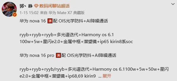 影像系统一直是nova系列的发力点。此次爆料指出,nova 16系列将继续深耕RYYB传感器技术,并配备多光谱迭代增强功能,辅以OIS光学防抖,有望在暗光拍摄和色彩准确性上实现突破。此外,全系预计将支持最高100W的有线快充,Pro版更在防水等级(IP68/IP69)和无线充电(支持50W)上具备优势,并搭载新一代星闪技术,在连接体验上保持领先。