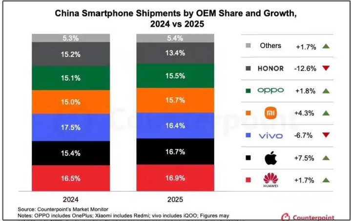 当Counterpoint 2025年最新中国手机市场份额报告出炉时,荣耀以-12.6%的同比增速跌幅成为榜单中最刺眼的存在。从2024年的15.2%到2025年的13.4%,这场两位数的市场份额跳水,不仅让荣耀跌出了头部阵营的舒适区,更折射出中国智能手机市场存量竞争下的残酷真相。