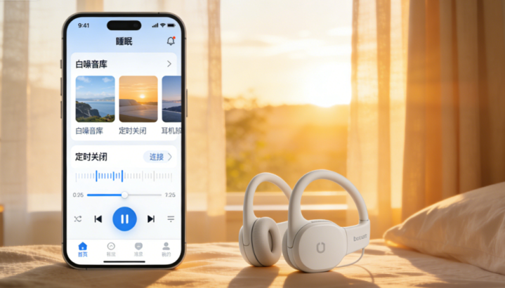 支持手机APP互联的耳机能升级助眠体验,可访问专属助眠内容库,灵活设置定时关闭、音量自动调节等智能模式。这类生态服务让耳机从播放设备升级为系统睡眠辅助工具,更科学便捷地助力优质睡眠。