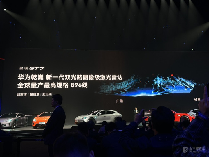 在缓助驾驶方面,启境GT7维持华为乾崑智驾L3级架构,搭载一颗华为双光路图像级896线激光雷达,预测还会配备2颗侧向激光雷达、1颗后向固态激光雷达、11个录像头、12个超声波雷达和5个毫米波雷达等30多个智能传感器。