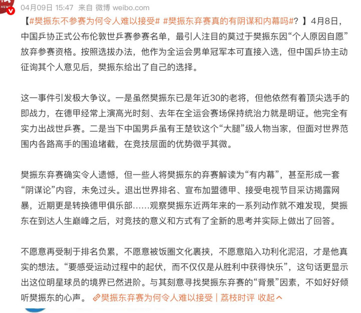 人所共知,樊振东已经详情不会投入本次伦敦团体世乒赛。在这个名单仍是公布之后,其实好多球迷皆计算纷纭。有的球迷意会樊振东因为行程突破的问题,莫得办法回来投入比赛。但另外一方面,也有少量部分的球迷合计樊振东这一次不可够追思比赛,到底是我方主动退出了,照旧训诫组条目他退出的?