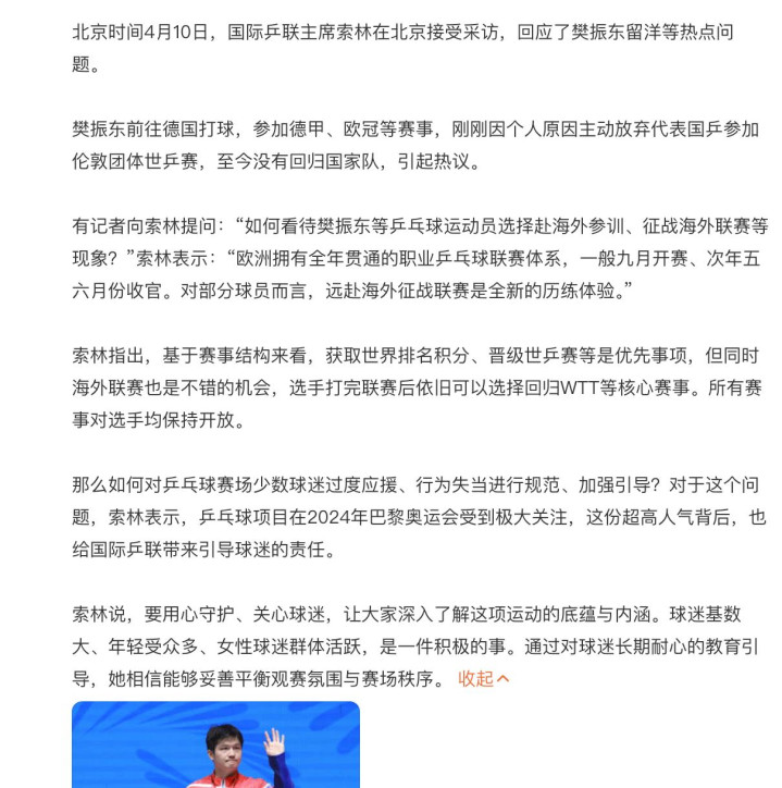 可以说外界的说法计算纷繁,也给咱们国乒这一次备战比赛带来了不少的纳闷。在这个风云不断发酵之后,国际乒联的掌门东谈主发声点名提到了樊振东留洋的情况。另外一方面,巨擘媒体也针对当前球迷质疑的一些问题进行了恢复。
