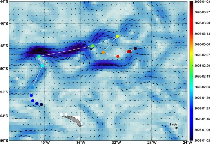 风浪卫星监测的A23a冰山漂移旅途(圆点为冰山位置,时分与右侧标注对应;图底色和箭头默示洋流)。(中国风物局供图)
