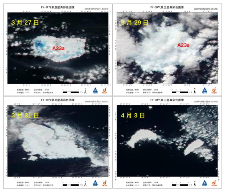 风浪风物卫星监测的A23a冰山末次垮塌真彩色监测图。(中国风物局供图)