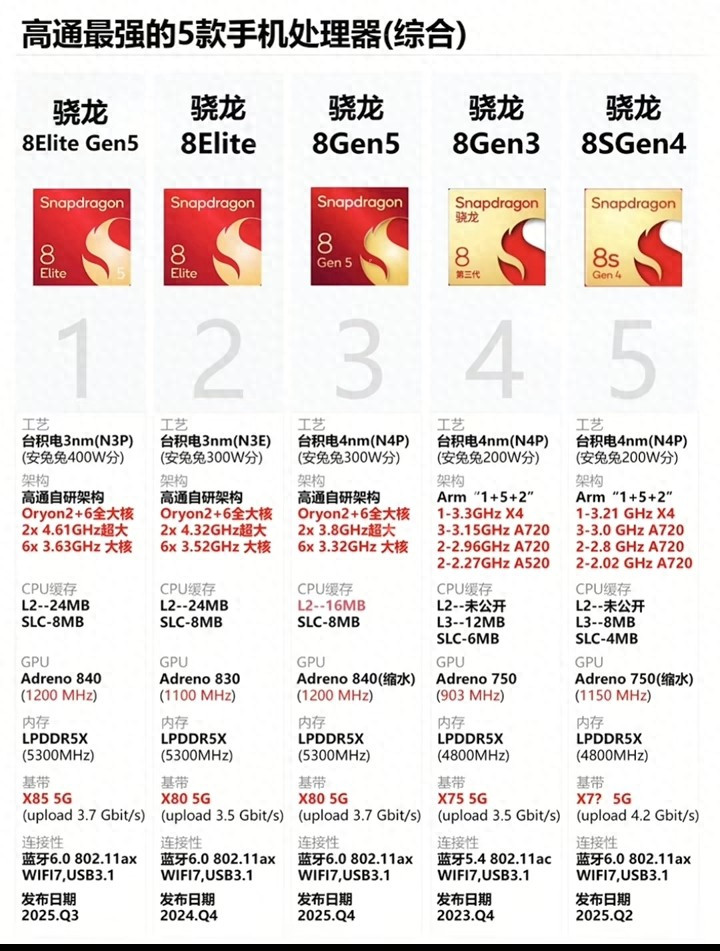 1:科技领域的竞争总是充满了变数与惊喜,而芯片作为智能设备的核心,更是各大厂商必争的技术高地。高通作为移动处理器市场的巨头,其骁龙系列芯片的每一次迭代都牵动着整个行业的神经。近期,一张关于高通最强五款手机处理器的参数图在网络上流传开来,这张图不仅详细列出了骁龙8 Elite Gen5、骁龙8 Elite、骁龙8 Gen5、骁龙8 Gen3以及骁龙8s Gen4的各项关键指标,更揭示了一个重要的行业趋势,那就是高通与台积电的深度绑定。从图中数据可以看出,这五款旗舰级芯片均采用了台积电的先进制程工艺,这无疑为芯片的性能和能效表现奠定了坚实的基础。