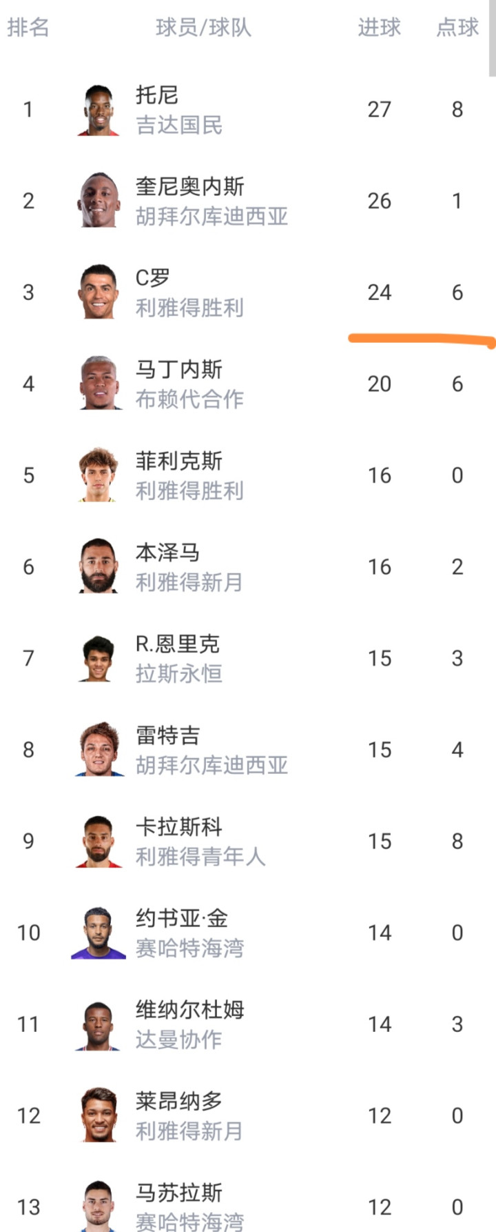 弓手榜C罗逾期榜首的托尼3球。