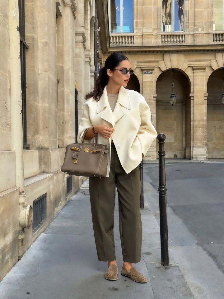 念念要把风衣+九分裤,穿出好意思丽的嗅觉,就要从版型高低手,选微廓形的版型,肩线略微宽出来少量,不错灵验地藏住上半身的不及,底下配一条九分收住脚踝,这种上松下紧的搭配法,你的形体比例会显得很舒展,