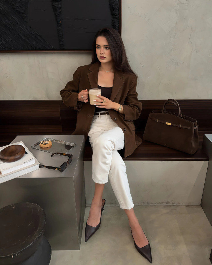No3、西装/夹克外衣+九分裤→带有垫肩的容颜,修饰线条感
